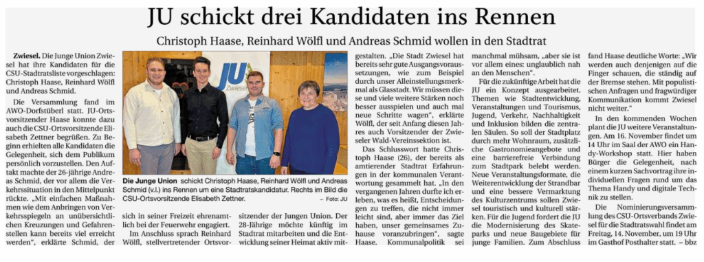 Für die zukünftige Arbeit hat die JU ein Konzept ausgearbeitet. Themen wie Stadtentwicklung, Veranstaltungen und Tourismus, Jugend, Verkehr, Nachhaltigkeit und Inklusion bilden die zentralen Säulen. So soll der Stadtplatz durch mehr Wohnraum, zusätzliche Gastronomieangebote und eine barrierefreie Verbindung zum Stadtpark belebt werden. Neue Veranstaltungsformate, die Weiterentwicklung der Strandbar und eine bessere Vermarktung des Kulturzentrums sollen Zwiesel touristisch und kulturell stärken. Für die Jugend fordert die JU die Modernisierung des Skateparks und neue Baugebiete für junge Familien. Zum Abschluss fand Haase deutliche Worte: „Wir werden auch denjenigen auf die Finger schauen, die ständig auf der Bremse stehen. Mit populistischen Anfragen und fragwürdiger Kommunikation kommt Zwiesel nicht weiter.“